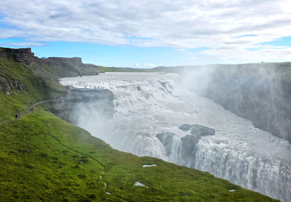Gullfoss, eller "Guldfallet", är ett av Islands mest ikoniska och kraftfulla vattenfall. Vattnet från glaciärälven Hvítá kastar sig ner i två etapper, totalt 32 meter, i en djup ravin. Namnet kommer ... läs mer..