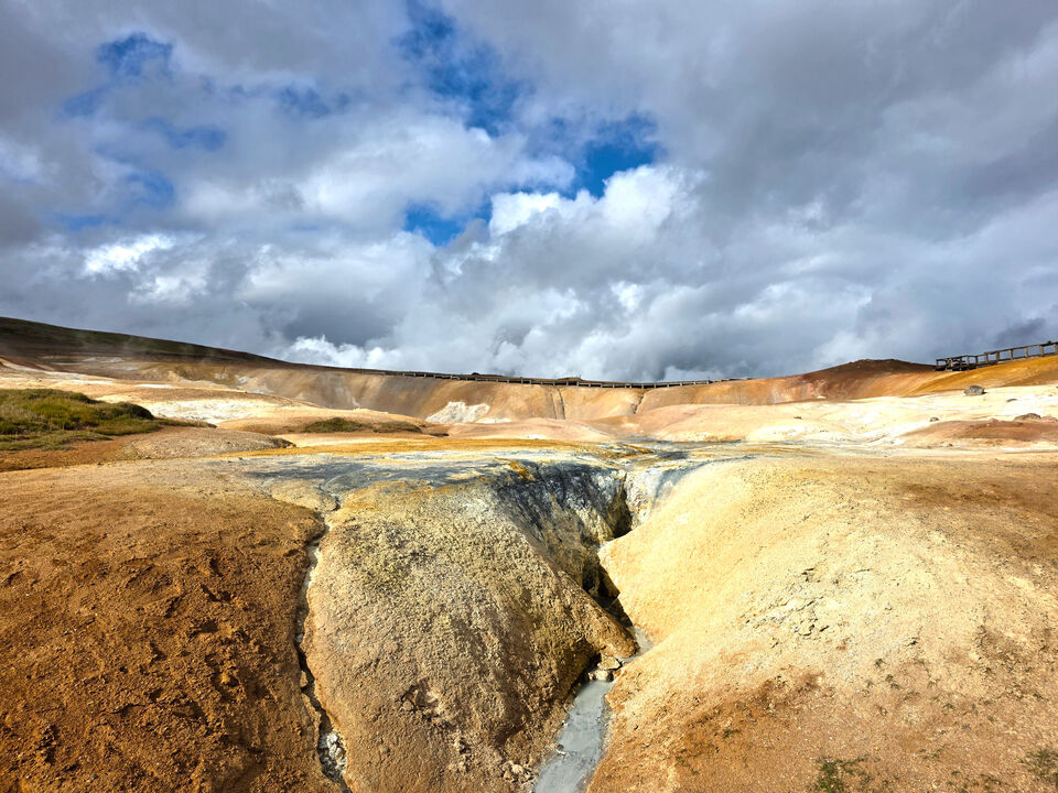 Vi rullar in mot Hverir, med blåsvarta moln som trogna följeslagare. Ett stilla duggregn smyger sig över landskapet, som om det först vill känna efter.